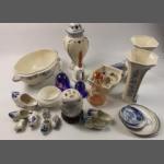 A collection of mainly blue and white ceramic items to include Delft vases, lots of decorative clogs, glass bells etc