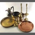 A metalware lot to include a SANKEY & SONS copper tray, another gallery tray, pair of heavy twist stem brass candlesticks, an EPNS coffee pot and others