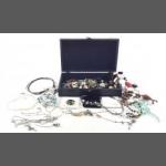 A wooden jewellery box containing a quantity of attractive costume jewellery. 26 x 15 x 6 cm approx