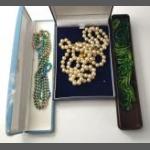 Pretty little collection of a pearl necklace with matching bracelet, a multi-colour bead necklace and a green shaded multi-strand necklace.
