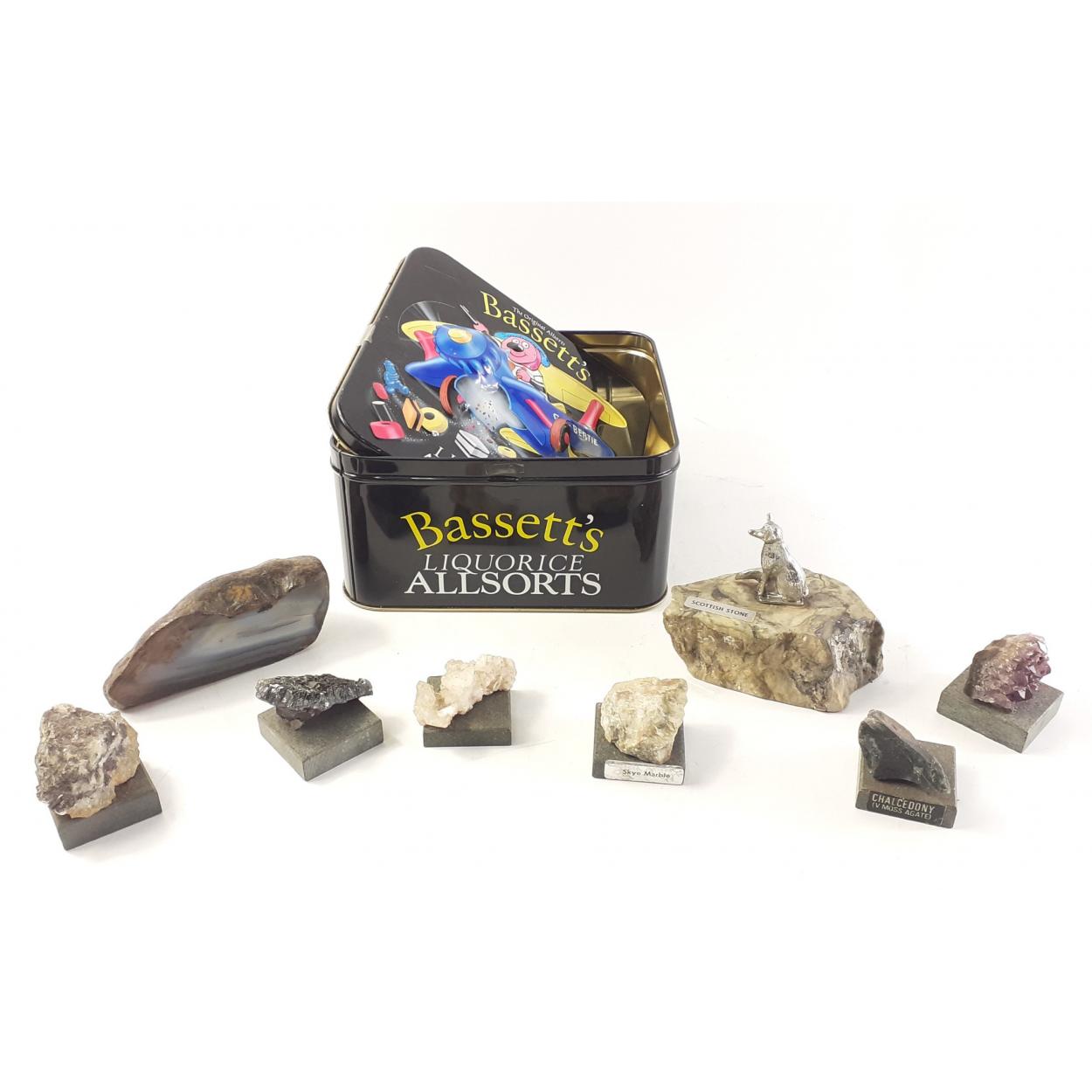 A BASSETT'S Allsorts tin with a small collection of polished stones and rocks.