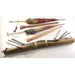 A vintage folding camp bed in good condition along with two bamboo handled umbrellas.