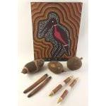 Intriguing little lot of Australian Aboriginal pieces of interest to include three decorated Baobab Nuts and two pairs of decorated talking sticks. Also a rather attractive Brolga Aboriginal painting on canvas by GRAHAM FIREBRACE of Hastings, Victoria, Australia. 45 x 35cm approx.