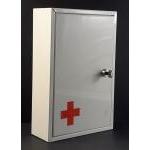 A RED CROSS metal wall box. 32cm x 22cm x 8cm approx In good order with key.