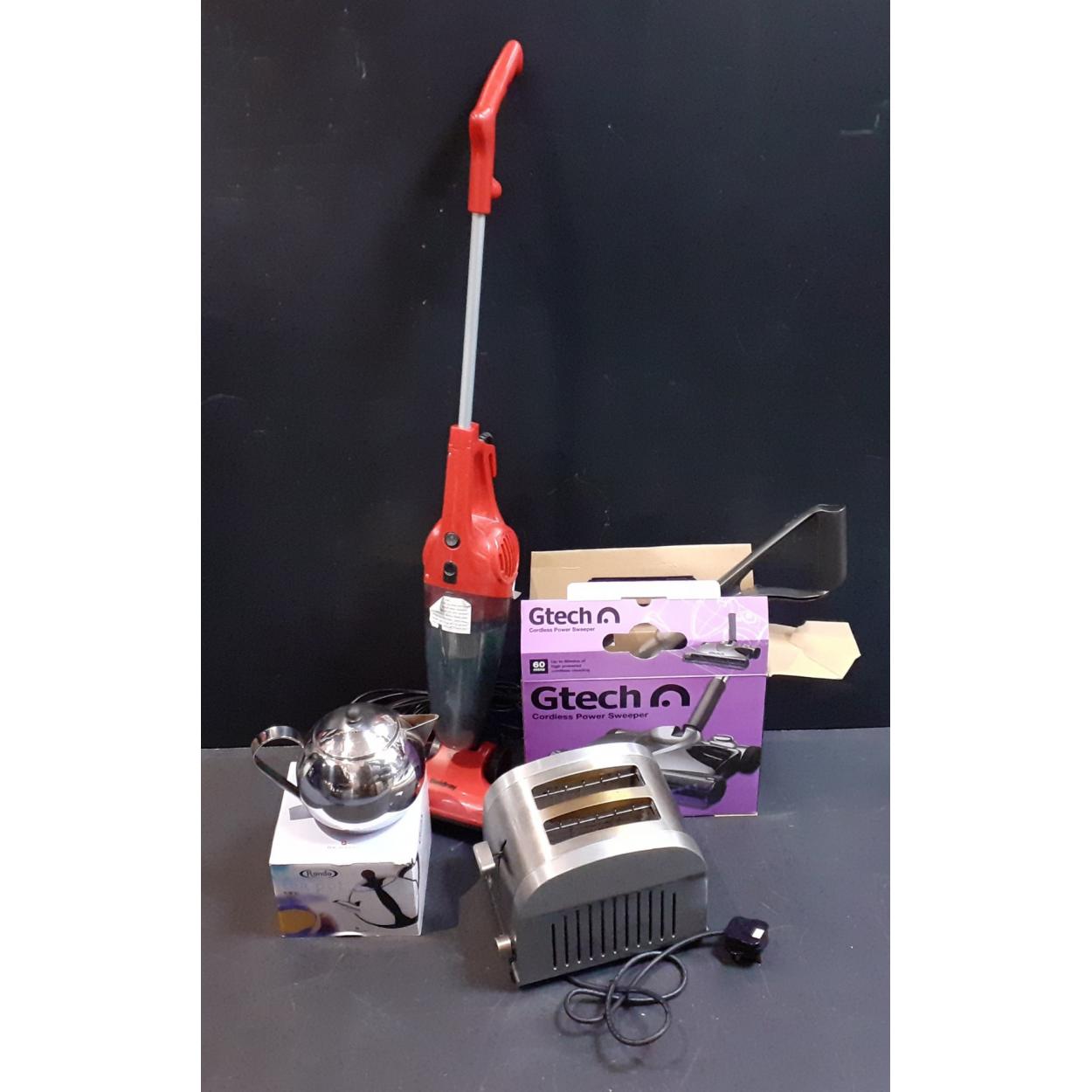 A RONDO metal teapot, 2 slice toaster, a Beldray steam cleaner and a GTECH rechargeable power sweeper (minus charger)
