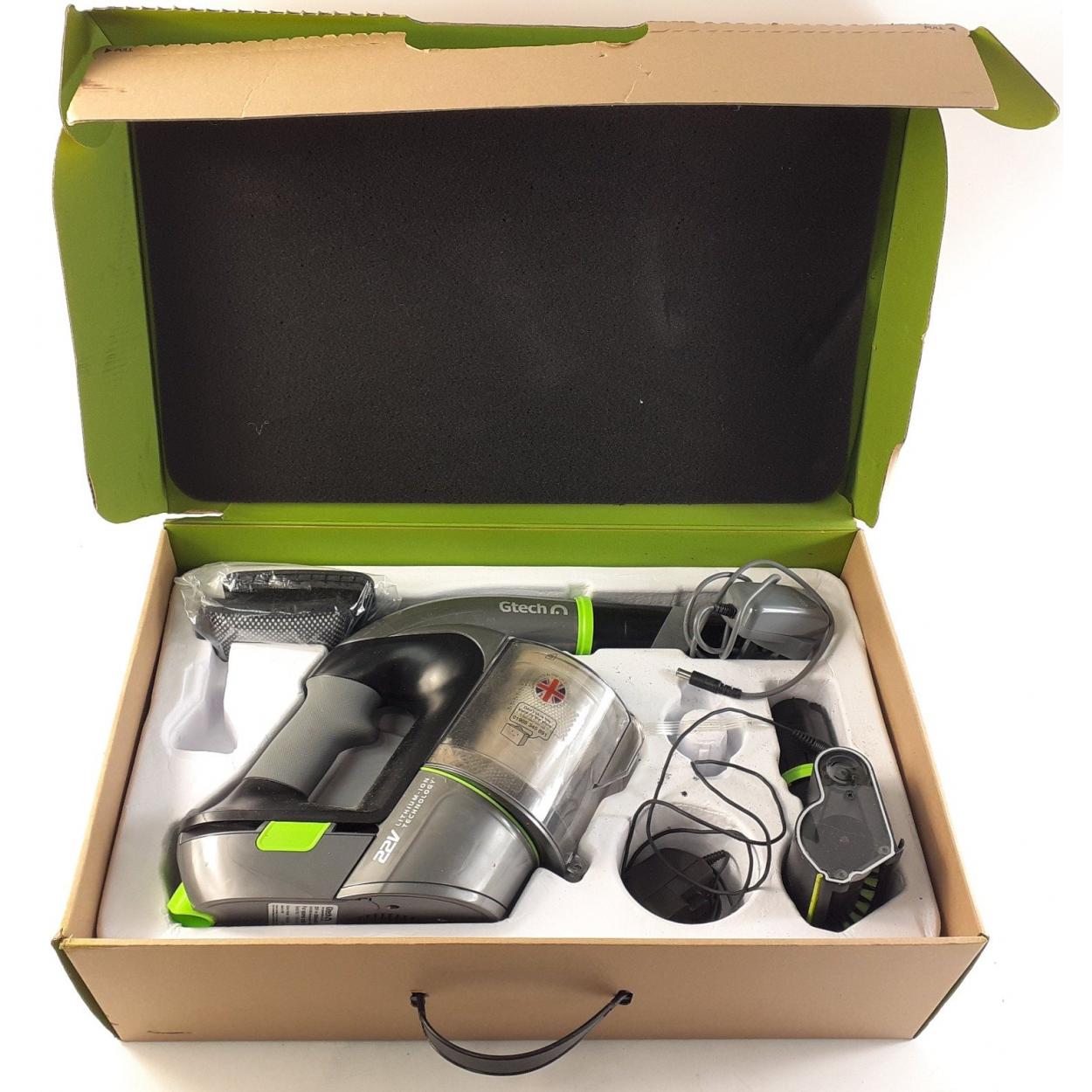 A GTECH 22v cordless vacuum cleaner in a box. Appears complete and in good condition.