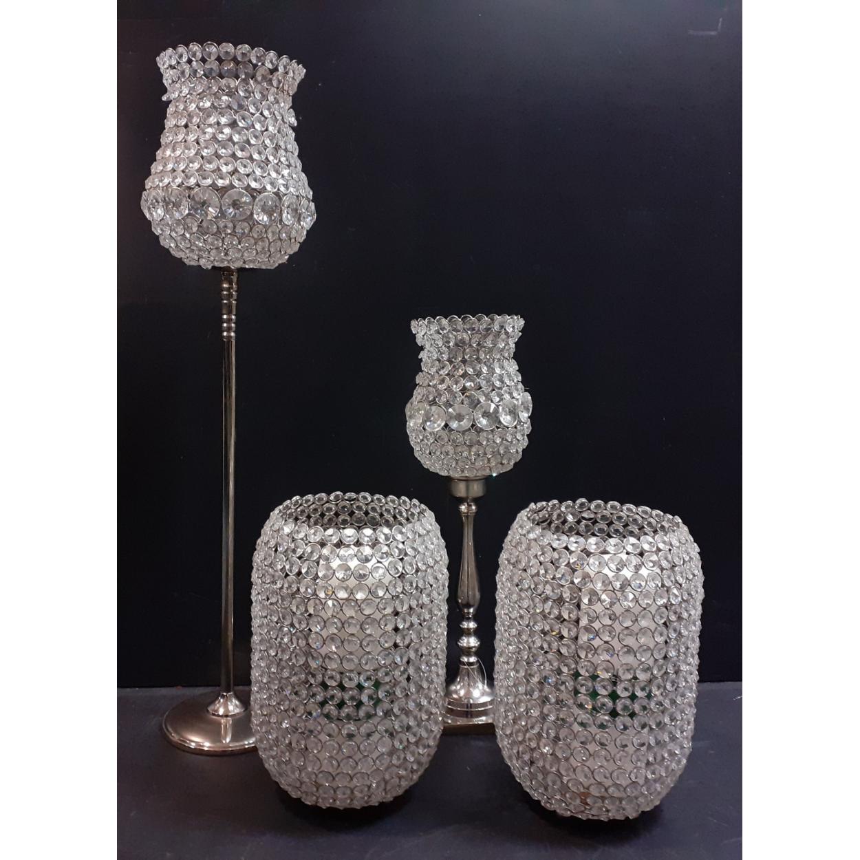 A collection of four chrome candle holders, tallest standing 75cm approx