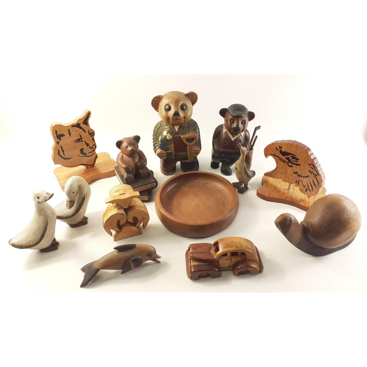 A mixed lot to include various carved wooden animal ornaments, mainly bears. Snail model, ducks etc.