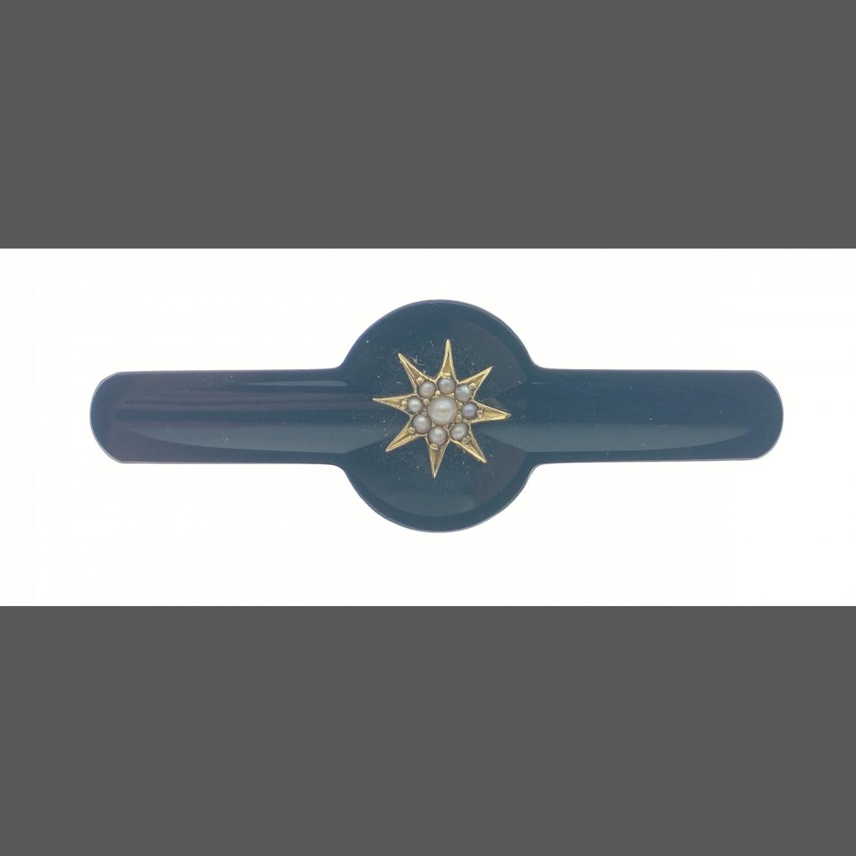 A small yet appealing black stone brooch possibly polished jet? with gilt and seed pearl star motif in centre. A very beautiful little unmarked item. 5cm long approx. Gross weight 5.7g approx.