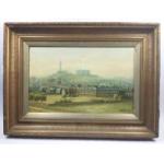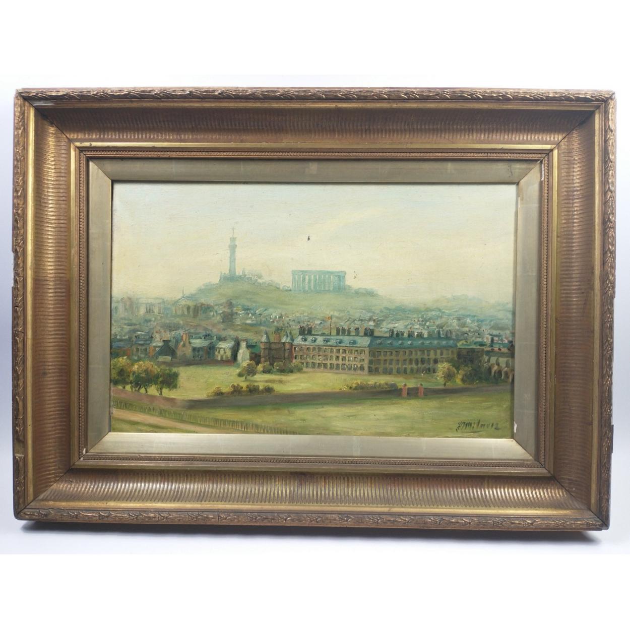 An antique oil on canvas depicting Holyrood House with Calton hill in the background, with a signature, possibly 'Milne 12', frame measures 75x54cm approx, there is a small hole in the canvas and some pieces of the gesso frame missing