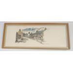 An original Ken Lochhead watercolour dating from 1971 of West Linton showing the Old Bakehouse, frame measures 52x22cm approx