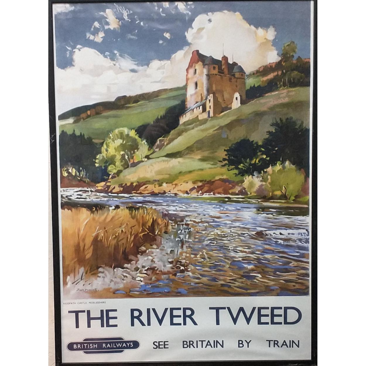 LOCAL PEEBLES VINTAGE RAILWAY INTEREST - A large framed poster showing 'The River Tweed Neidpath - original artwork was by Jack Merriott - dimensions 97cm height x 70cm width - all set within a nice glazed frame with black border - what a nice Xmas gift for someone special!