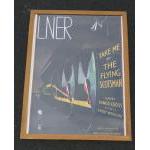 ''TAKE ME BY THE FLYING SCOTSMAN' - Vintage Railway Poster print of Take Me by the Flying Scotsman. Large QUALITY light oak rimmed glazed frame - would make an interesting and FABULOUS XMAS GIFT! Additional info; Artist Alfred Thomson created the image in the Art Deco style, emphasising the huge scale and sleekness of the Gresley A1 class locomotive that bore the name of the famous London to Edinburgh service. The painting appeared on a London and North Eastern Railway (LNER) poster from 1932, accompanied by the slogan ‘Take Me by the Flying Scotsman'. The composition, which shows a young girl in a hat looking up in awe at the driver of the train, is a pastiche of an earlier Southern Railway poster. - dimensions of frame 103cm height x 78cm width approx