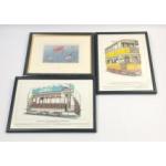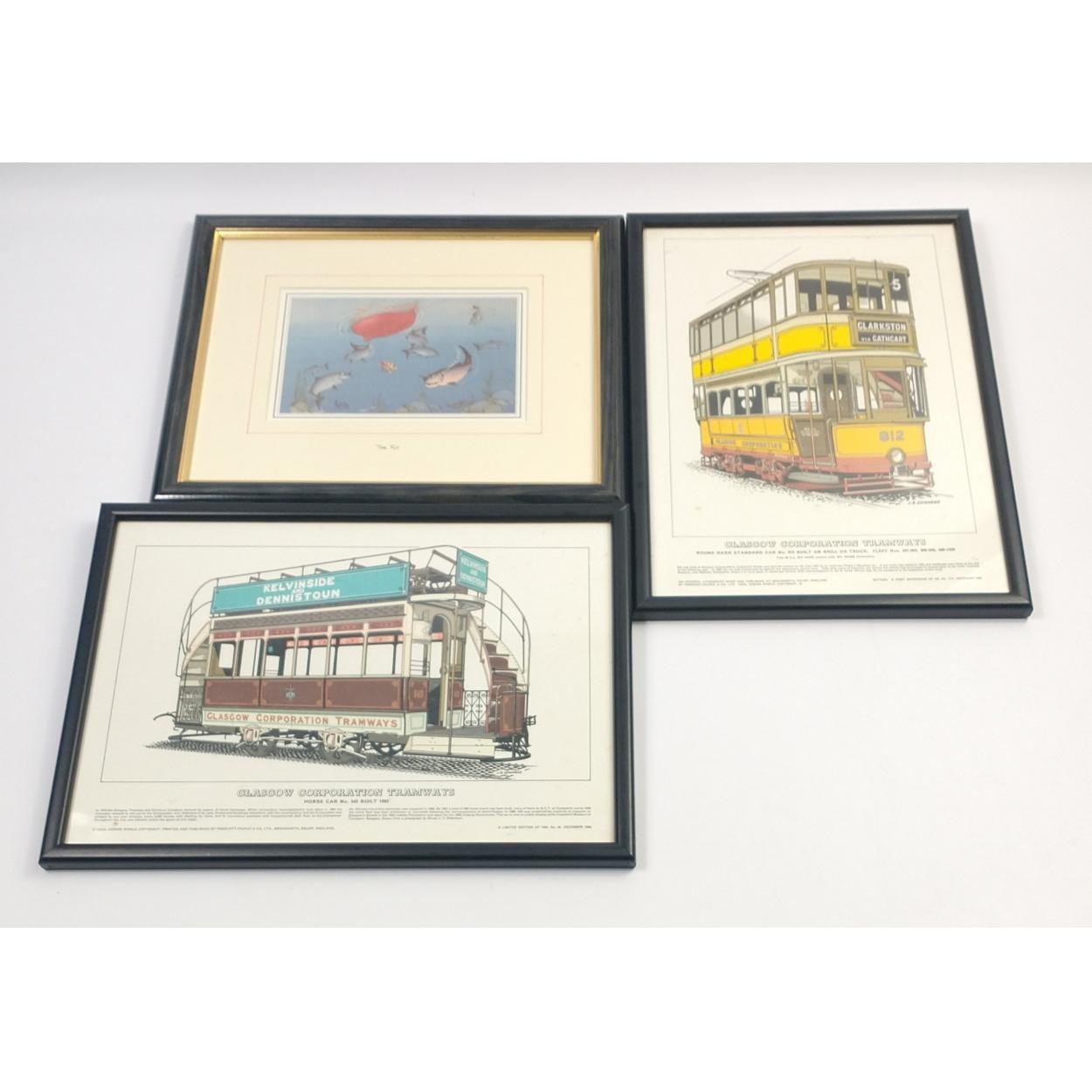Two prints of GLASGOW CORPORATION TRAMWAYS, frame size 33x25cm approx and a humorous picture called 'The Fly' frame size 30x26cm approx