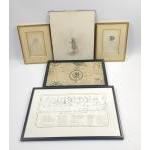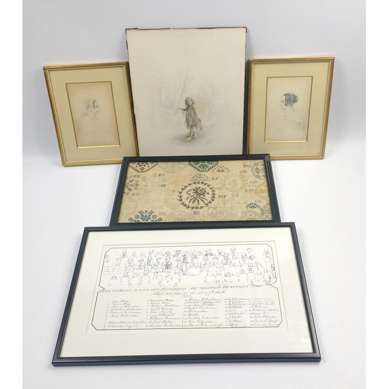 Artwork from the 19th century to include 2 pencil sketches of Rachel and Margaret Priestman (frame size 24x19cm approx ), a cross stitch sampler completed by Rachel Bragg (born 1791) who was sent to school in Tottenham because of the strength of her Newcastle accent! The sampler includes the initials of her school friends and a seating plan for the wedding of Lucy Ann Richardson and Jonathan Priestman in 1832 (frame size 42x28cm) and an unusual photo of a wee girl dressed as a fairy with a woodland scene sketched in behind her, frame measures 30x26cm