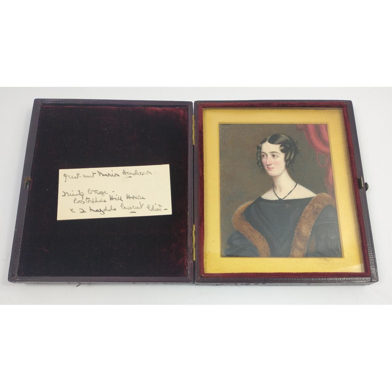 Antique c19th century miniature portrait of a lady, hand-painted oil and framed within a presentation quality leather-bound and velvet travel frame - the lady in question is believed to be (Great Aunt) Miss Henderson who stayed at Trinity Cottage?(indistinct writing), Corstorphine Hill House Edinburgh - dimensions of the portrait 8cm width x 10.5cm height