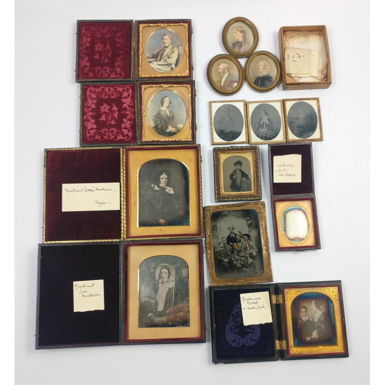Antique miniature hand-painted oil portrait 8cm height x 6cm width and a quantity of antique mid 19th century framed picture mirror images believed to be all of The Henderson Family of Edinburgh - also a set of three good quality miniature photographic images 6.5cm x 5cm with gilt metallic frames and a nice c19th century triple oval framed miniature hand painted family portraits - 11 items in total