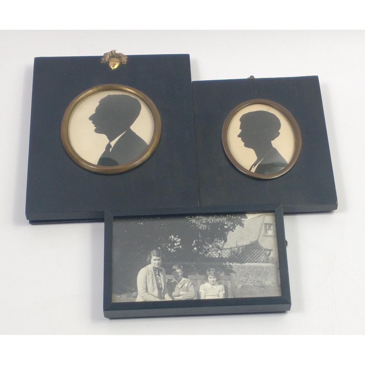 ANTIQUE - Two framed silhouettes of a lady and a gentleman and a framed family photograph - the gentleman is Colonel Edmund Farquar St John born February 1879, married Henrietta Frances Dalmahoy June 1921, the lady is unmarked with no details, but reputedly they are husband and wife c1921 - largest silhouette frame size 14cm x 17.5cm approx