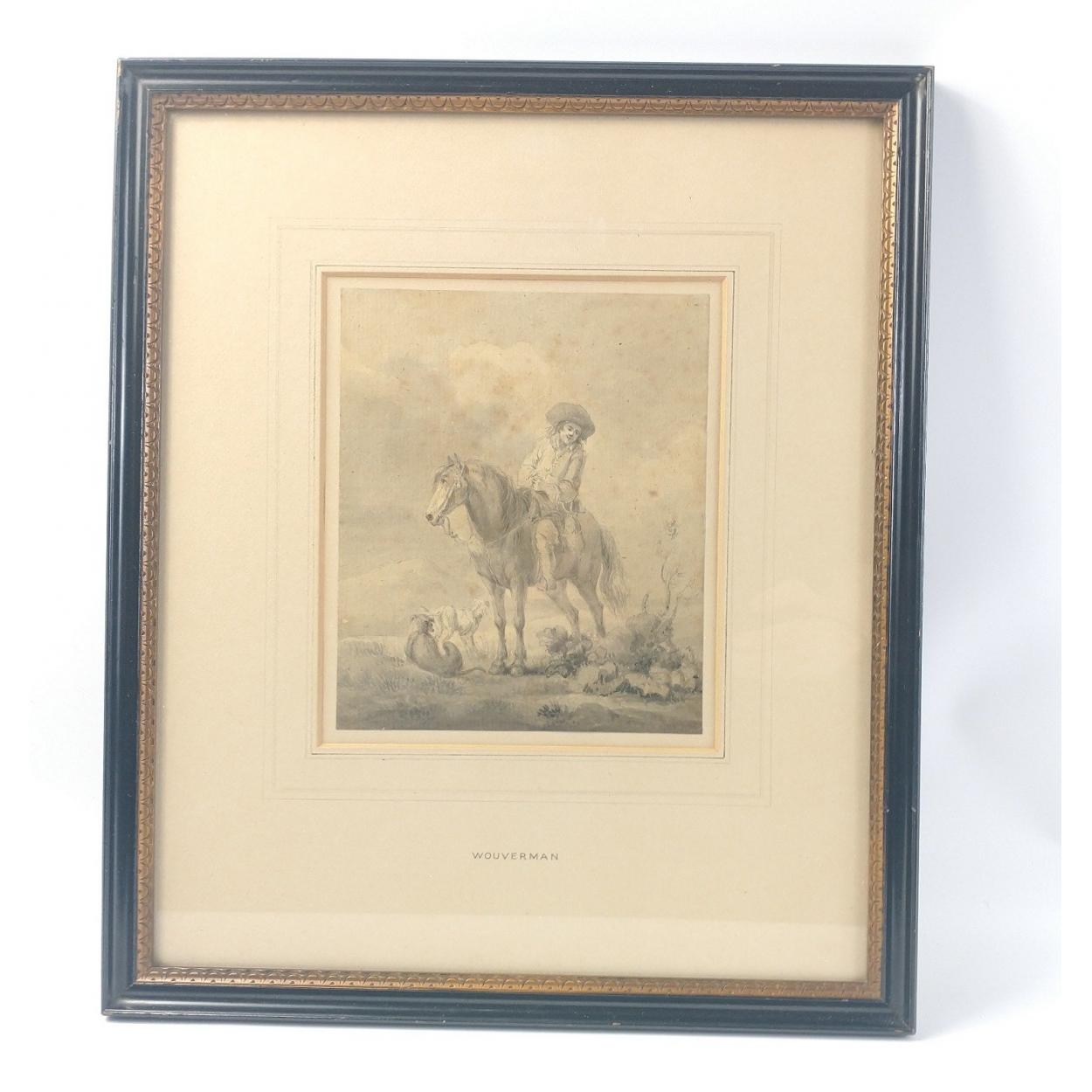 After WOUVERMAN - an artwork of unknown media with some foxing of a man on horseback with 2 dogs, frame measures 42x36cm, visible work 19.5x16cm