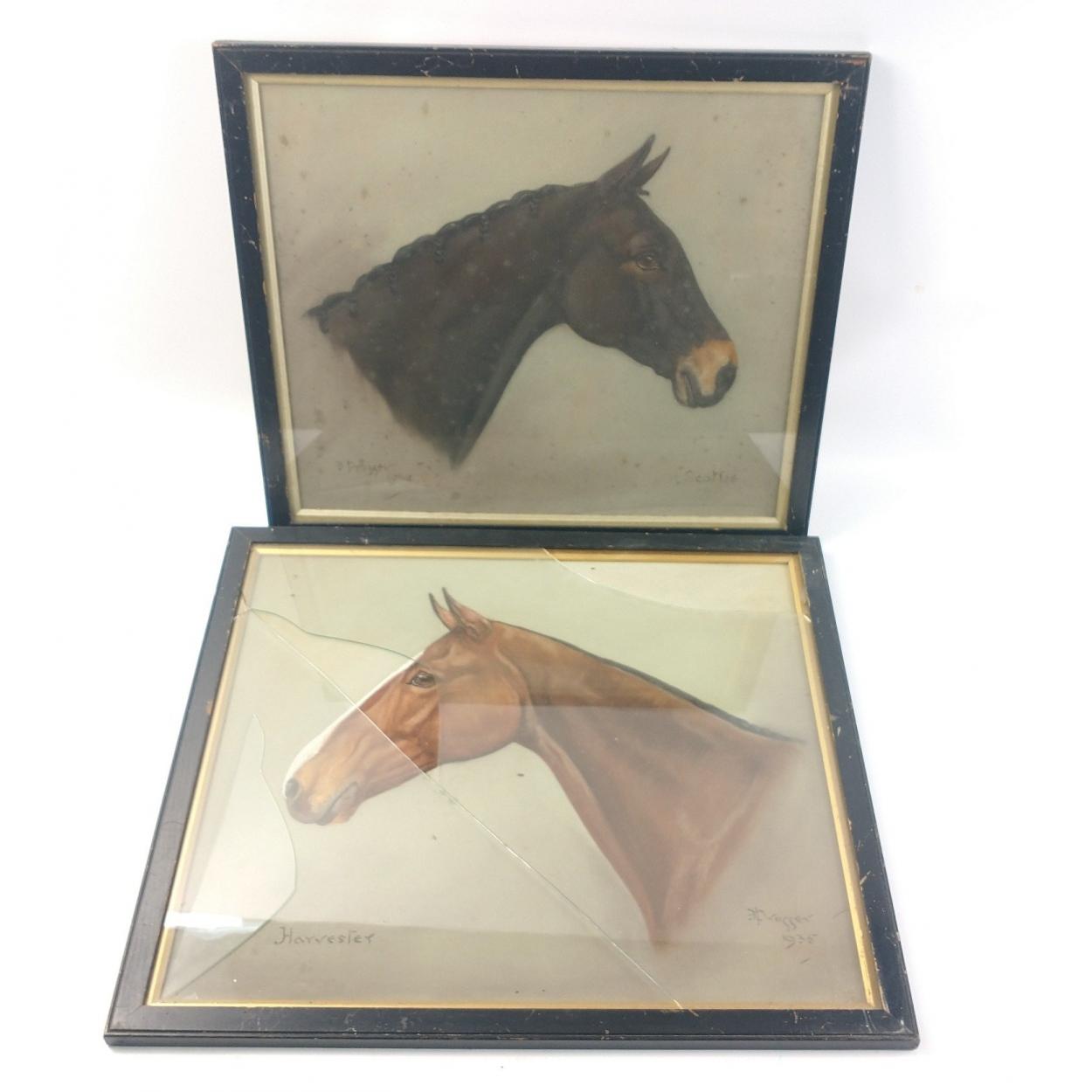 Two FASCINATING studies of horses' heads from 1934 and 1935 by E PROSSER signed by the artist, frame size 43x37cm ('Scottie 1934') and 47x42cm ('Harvester1935'), glass broken on latter picture