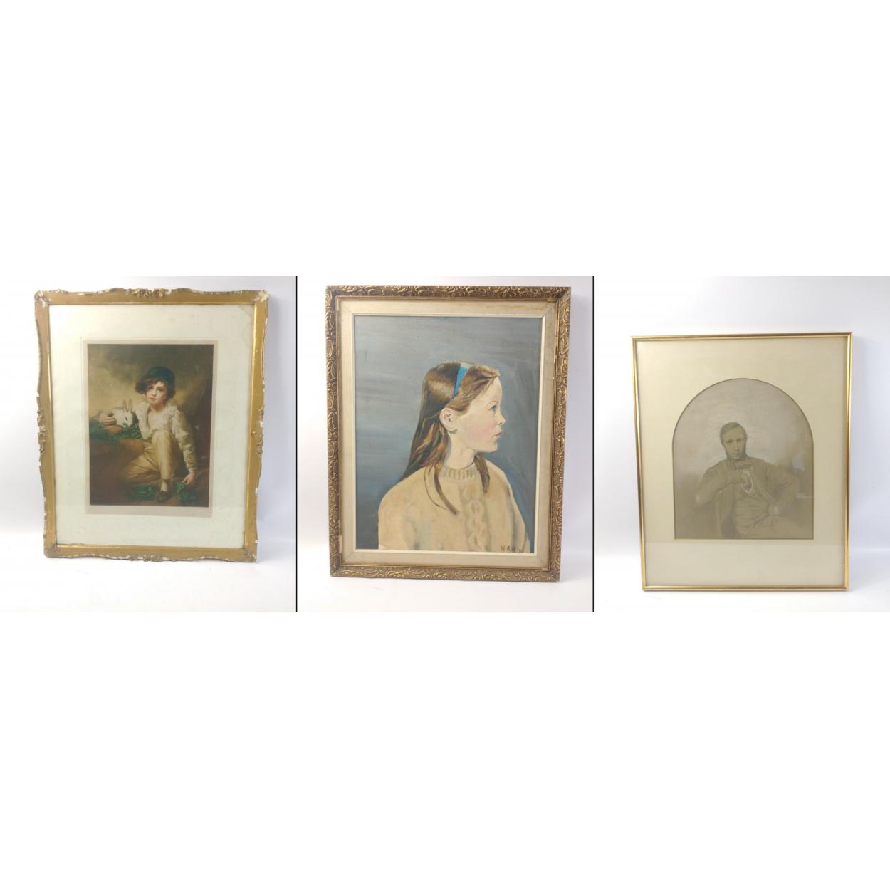 A portrait, oil on canvas of a 20th century young girl (frame size 61x49cm approx), artist unknown, a chalk and pastel portrait of a 19th century young man, no artist details (frame size 55x45cm approx, visible work 34x30cm approx), and a colour print of a young boy with rabbit signed in pencil by T HAMILTON CRAWFORD, (frame size 58x49cm approx, visible size 35x27cm approx), some damage to the frame