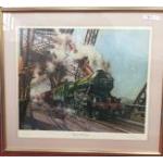 A large framed signed print of THE FLYING SCOTSMAN crossing the Forth Road Bridge on 16th May 1964 by Terence Cuneo , the print like many of his works has a mouse hidden within it , signed in the margin by the artist , Sir William McAlpine and Alan F Pegler , the frame measures 89cm x 79cm