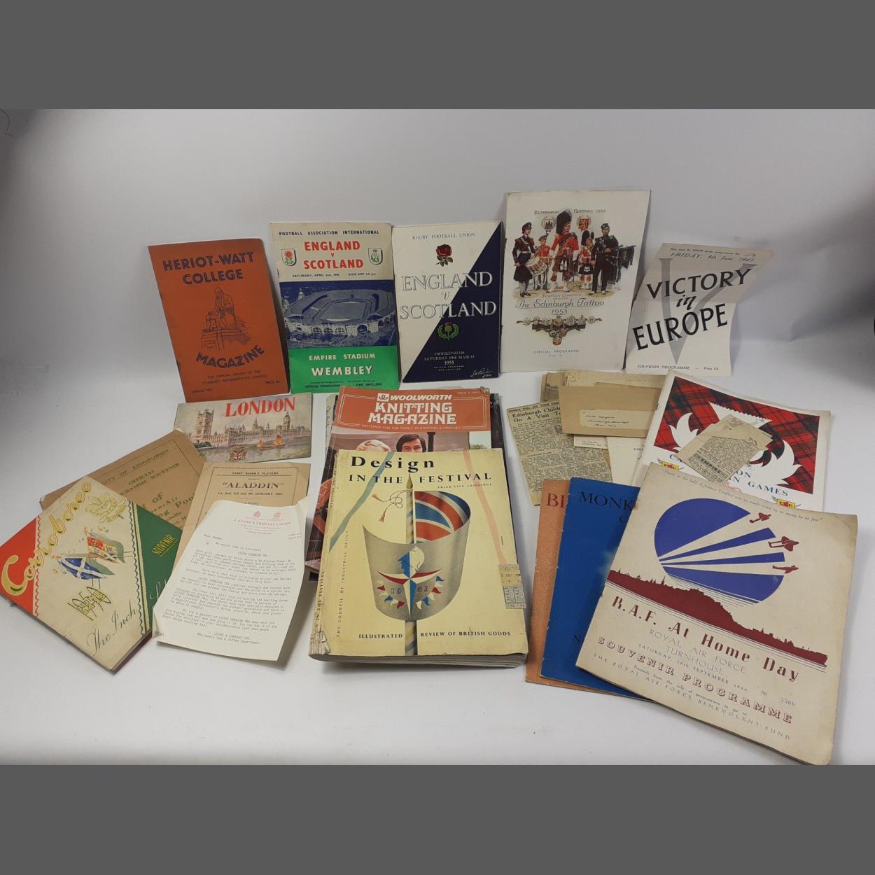 A small bundle of assorted EPHEMERA including a 1951 DESIGN IN THE FESTIVAL magazine , Scotland v England programmes , NEWSPAPER cuttings and much more
