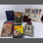 A super collection of vintage childrens books to include THE CHILDRENS RAILWAY BOOK which contains some lovely colour illustrations. Lot also includes ephemera with two Edinburgh School Merit certificates from 1916 as well as a leather wallet, Patience cards etc.