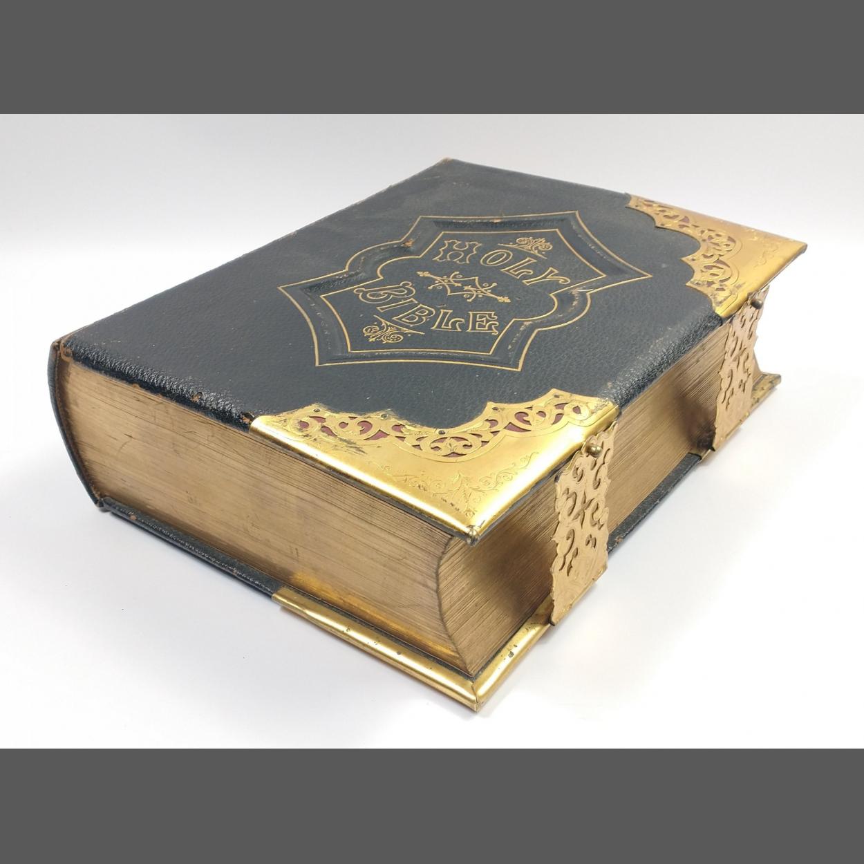 The National Comprehensive Family Bible (ILLUSTRATED). THE HOLY BIBLE with an abridgement of the Commentaries of Scott and Henry & containing also many thousand critical & explanatory notes selected from the standard authors of Europe & America, edited by the Rev John Eadie, published by Thorne & Co, Twickenham with brass corners and catches and a brown leather cover and gilt writing, measures 33x26x10cm