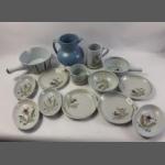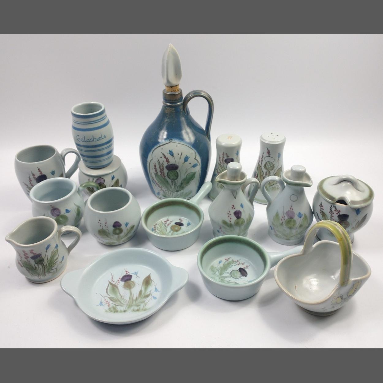 A selection of BUCHAN OF PORTOBELLO stoneware items including a Hebrides pattern 19cm diameter handled dish with a pouring spout, a plain blue jug standing 18cm tall, a large 13cm tall thistle design mug, four 17cm thistle design plates, four small 17cm long oval thistle design dishes, a small thistle design jug, a similar 15cm diameter cereal bowl and a 14cm diameter dish with a handle, all in good condition