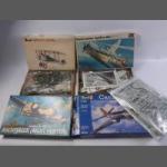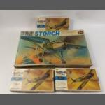 HASEGAWA1/32 Model Kit of FIESLER STORCH in original bag, also three 1/72 HASEGAWA SPITFIRE MKIs in original boxes one with open bag. Boxes may have stains and wear from long term storage
