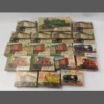 MODEL RAILWAY OO / HO layout enthusiasts accessory and diorama kits and accessories. An exciting collection from a model railway enthusiast's collection. Includes ballast, signage as well as unbuilt cardboard model kits, scenic backgrounds and a tin full of superb figurines. A really exciting collection.