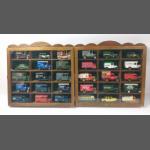 Two small wall mounted display cases each with 15 toy trucks by various makers including LLEDO , DAYS GONE BY and MATCHBOX , the cases measure 29cm x 33cm