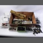 MODEL RAILWAY ENTHUSIAST LOT. A box containing metal O Gauge locomotive bodies in unfinished condition with loose trucks, bogies, parts, motors etc. some interesting pressed brass carriage sides and some diorama scenic pieces. Interesting lot.