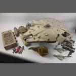 MAY THE FORCE BE WITH YOU ! Attic find original STAR WARS toys from the 1970/ 1980s. Millennium Falcon by Kenner Products 1979, Jedi Y Wing Fighter vehicle by Kenner and stamped 1983, An AT-ST Walker stamped Lucasfilm 1982. Also includes a Jaba The Hut with Dungeon and three 1980s produced figures. An interesting collection of contemporary toys coming from a Galaxy far far away. All unboxed with wear from long term storage.