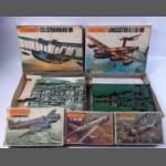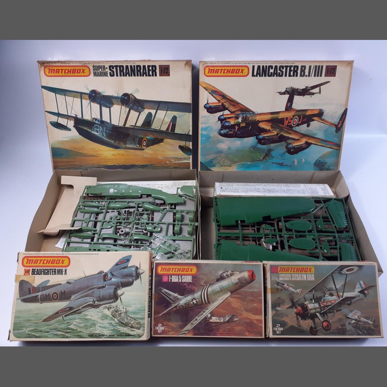 MATCHBOX 1/72 Model Kits x5 including SUPERMARINE STRANRAER, AVRO LANCASTER B1.IIII in large boxes and BEAUFIGHTER MK-X, F86 SABRE, SISKIN IIIa in smaller boxes. All kits from the late1970's unbuilt but opened, appears complete. Boxes are in fairly poor condition from long term storage