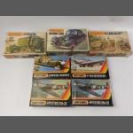 MATCHBOX 1/72 Model Kits x7 including 4 x Aviation 2x SPITFIRE MKIX, P51D MUSTANG, HAWKER TEMPEST in smaller boxes, also incudes MONTY'S CARAVAN, WILLY's JEEP and a CITREON 11 LEGERE car All kits from the late1970's unbuilt but opened, appears complete. Boxes may have stains and wear from long term storage