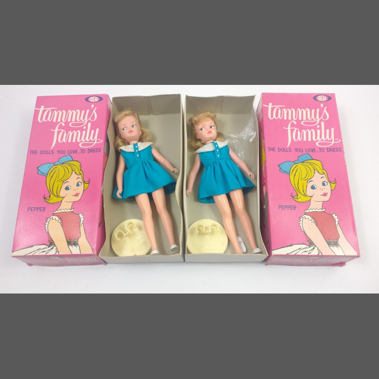 Two boxed and in what looks like as new condition small 23cm tall dolls by IDEAL from the TAMMY'S FAMILY range both dolls come in original boxes and are complete with stands