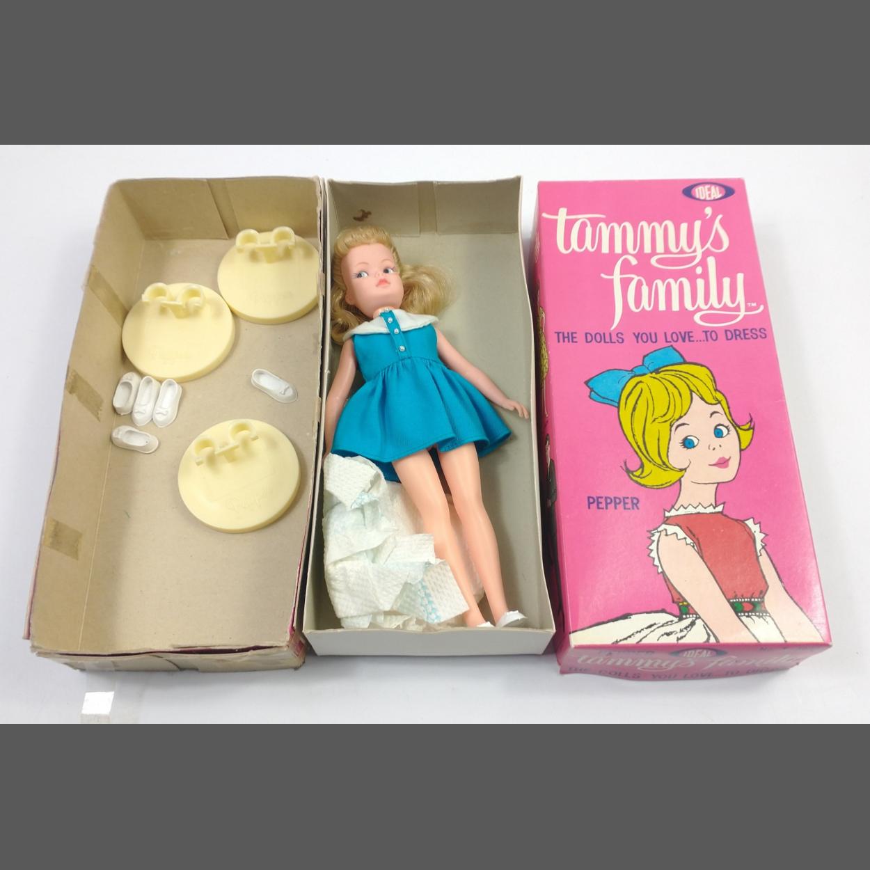 A small 23cm tall vintage doll from the TAMMY'S FAMILY range in like new condition and complete in original box with stand also 3 stands and spare shoes from the same range