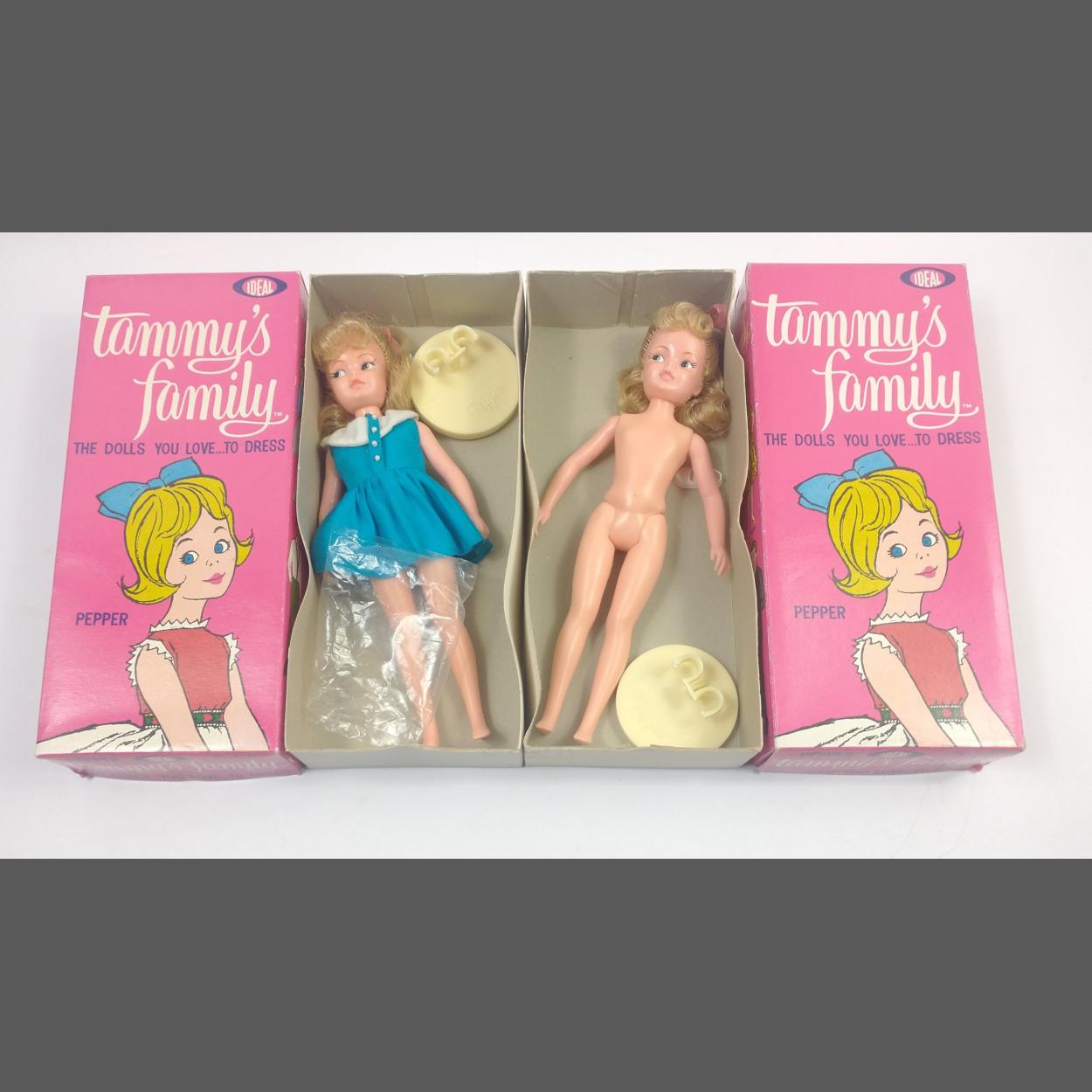 Two vintage small and as new boxed dolls by IDEAL from the TAMMY'S FAMILY range , one is dressed the other has no clothes , both dolls have original boxes and stands