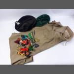 A vintage large size BOY SCOUT shirt with some badges and a shoulder badge for 5th PORTOBELLO , a cap E1147 THE WOLF CUB , an envelope full of cloth and metal badges relating to the BOY SCOUTS and a Scout Cap