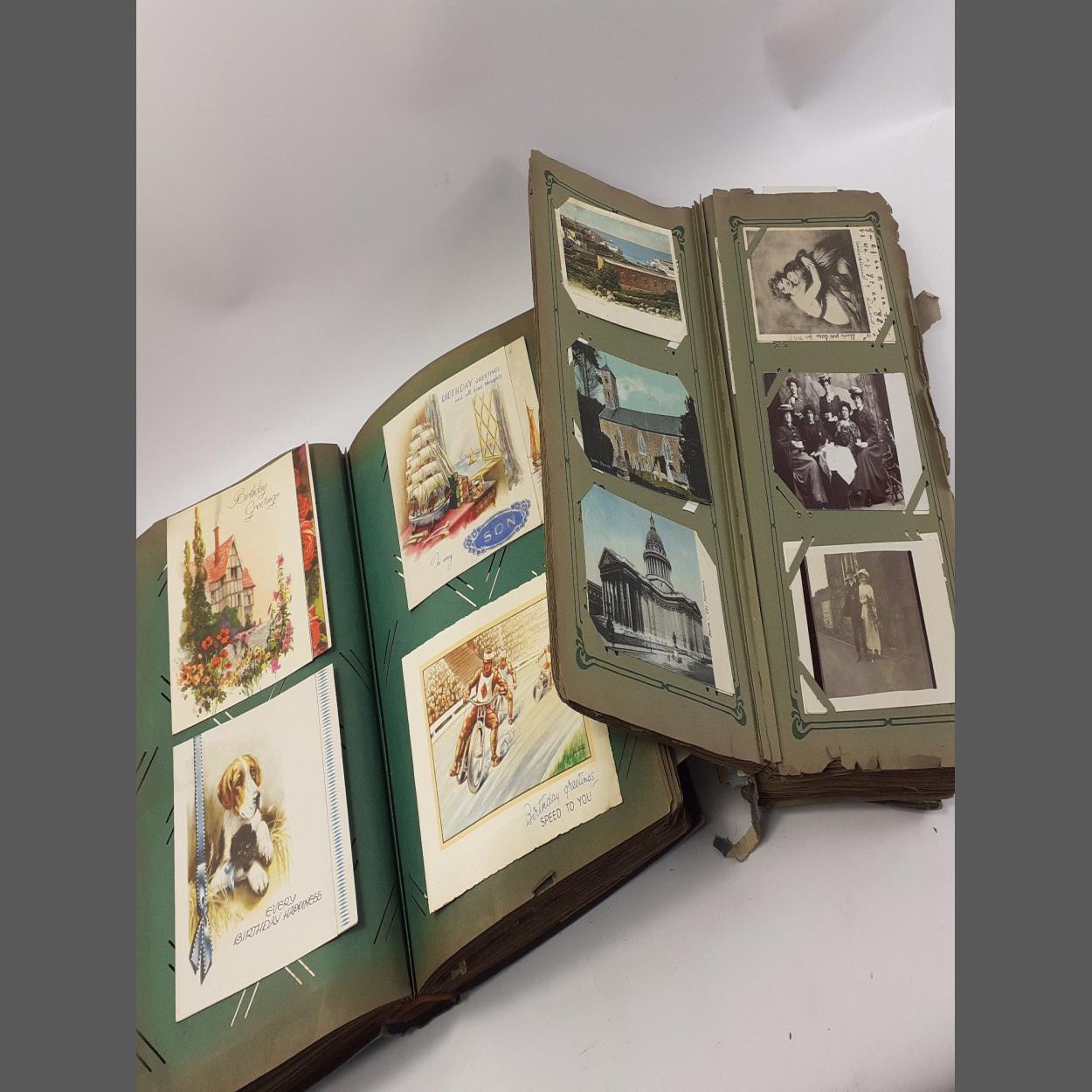 Two old postcard albums filled with mainly greetings style cards, some topographical and social interest. etc. Many hundreds of cards included.