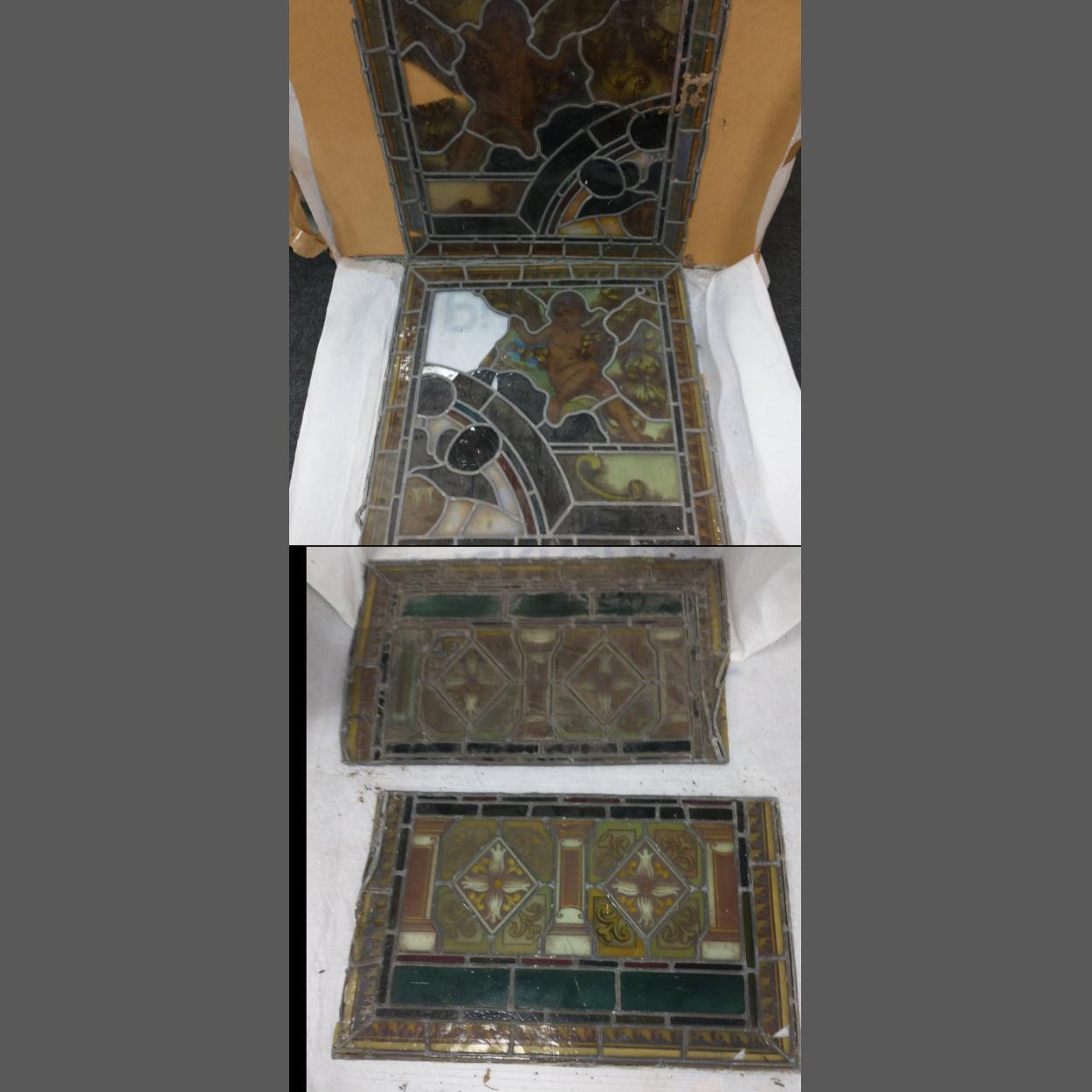 GRACEFUL! 4 panels of antique STAINED GLASS each requiring some restoring , the two larger panels show children and floral scenes measuring 67cm x 69 cm and the two smaller ones show floral scenes 67cm x 42cm