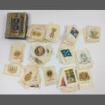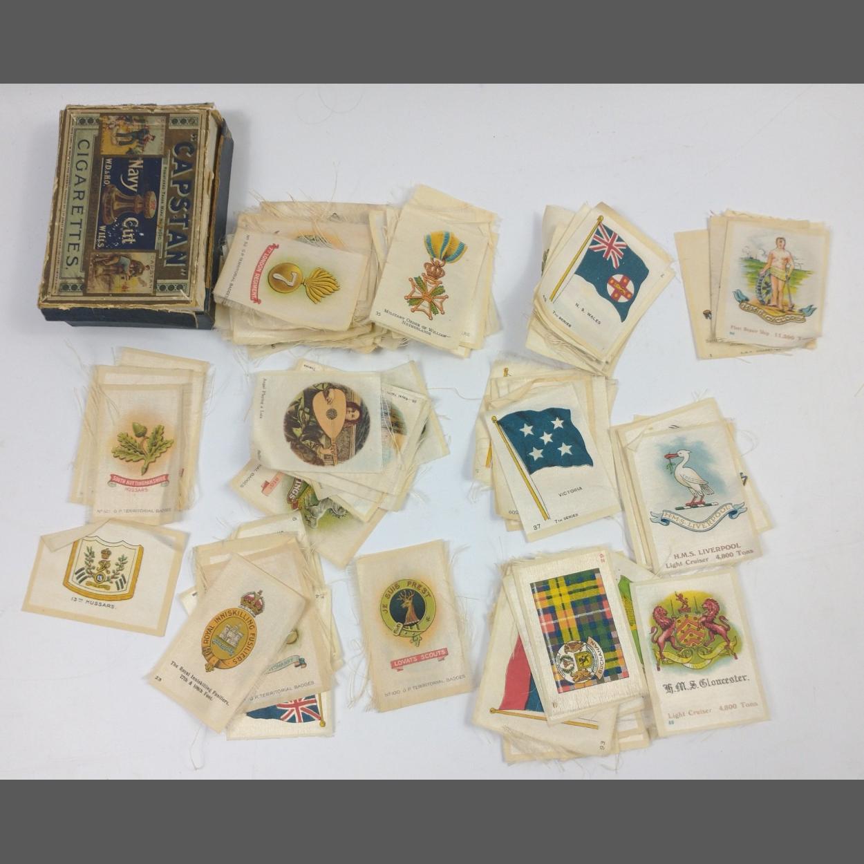 A Capstan cigarettes box full of KENSITAS SILK CIGARETTE CARDS including badges of many long defunct army regiments (The Royal Scots Lothian Regiment (1st foot), Ayrshire Yeomanry, Lothian & Borders Horse), military medal badges, country flags, Royal Navy pennants, historical figures including Parnell and Daniel O'Connell