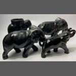 A collection of vintage pottery black ELEPHANT ornaments, one being a pot plant holder 18cm height x 21cm length approx) , an IMPRESSIVE two being a pair(25cm length x 16cm height) and one smaller one being black glazed 20cm length x 15cm height approx - with an AFRICAN carved elephant bridge ornament