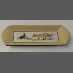 COLLECTIBLE! A 23cm long hand painted pen tray or pin dish decorated by PRISCILLA KENNEDY featuring a FOX and a RABBIT dated 2004