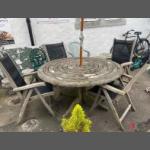 A hardwood garden dining table diameter 1.5m approx with 4 SUBSTANTIAL folding hardwood chairs AND a top quality wind-up and down cream based cotton garden parasol by ALEXANDER ROSE comes with the table 6ft diameter approx The table legs require some re-fixing but what a handsome table set!!