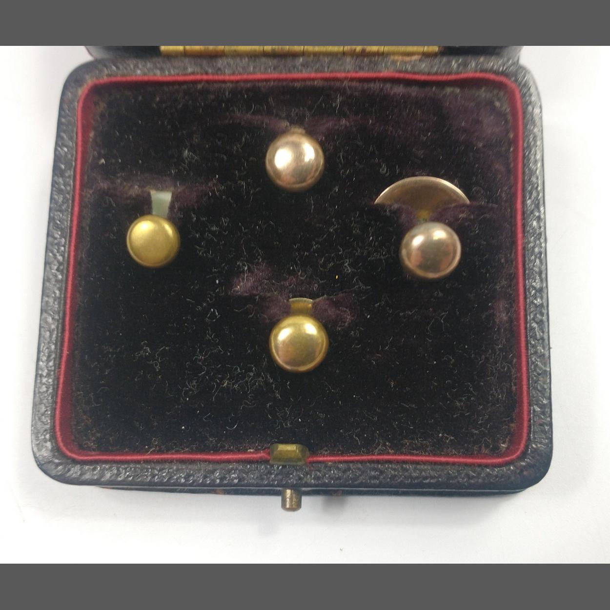 A small vintage jewellery box from JOHN H STORER of Glasgow containing a small pair of yellow metal studs both bearing the makers stamp JHS and one marked 9 also a slightly larger one with the same maker total weight for the three of 6 grams and another stud with MOP.