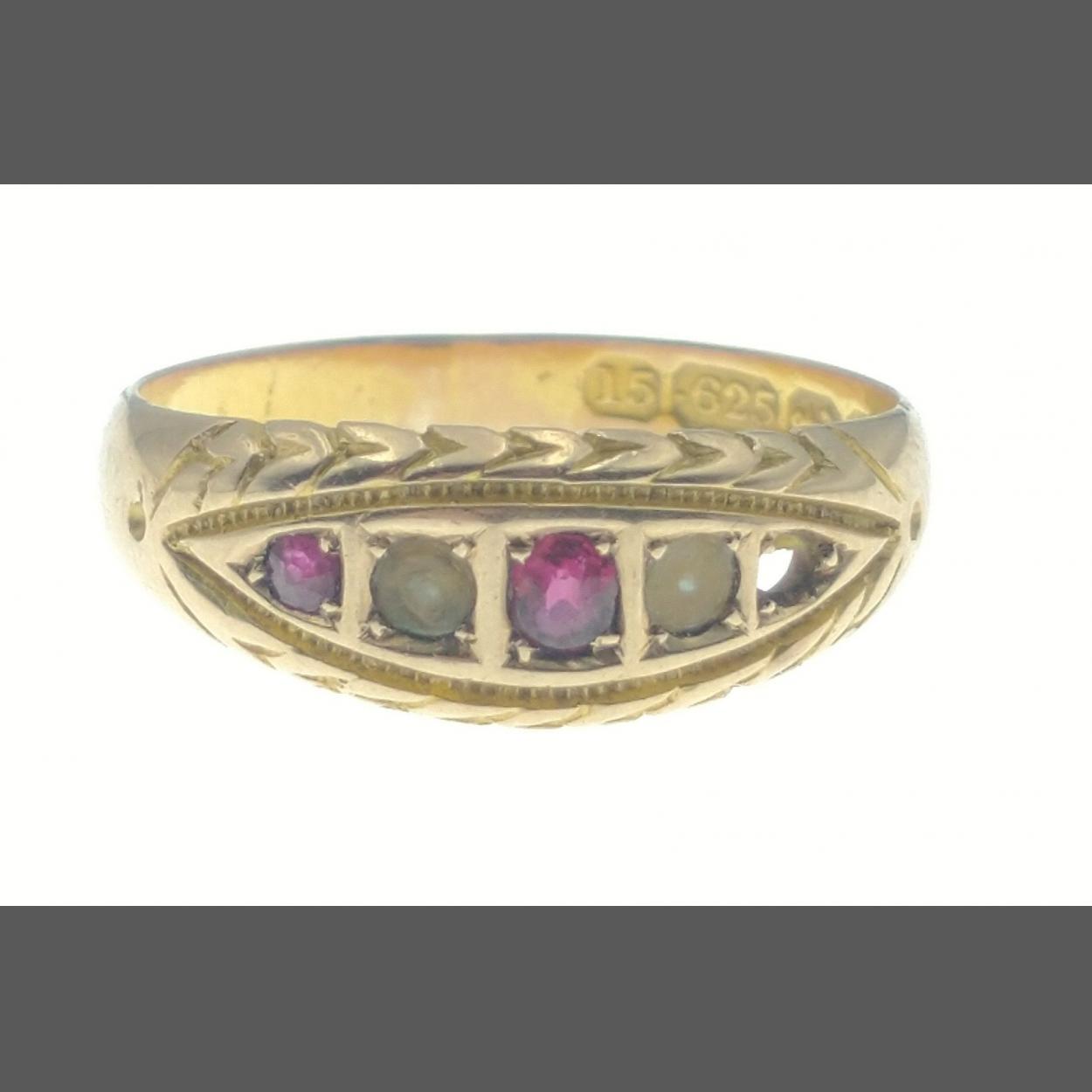 A 15ct 625 stamped yellow gold dress ring with garnets and wee seed pearls and white stones- alas one small garnet is missing but this is hardly noticeable - this is a pretty wee ring! - ring size K and weight gross 2.75g approx