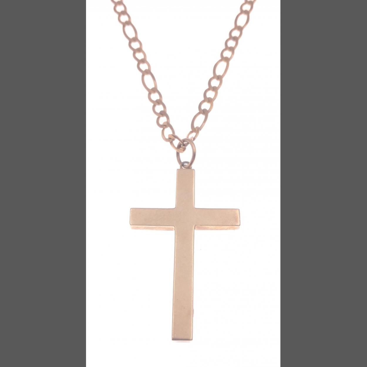 375 Sheffield Hallmarked yellow gold cross dimensions 4cm height x 3cm width weight 9.195g approx with a 9kt stamped chain 66cm long and weights 9.35g approx